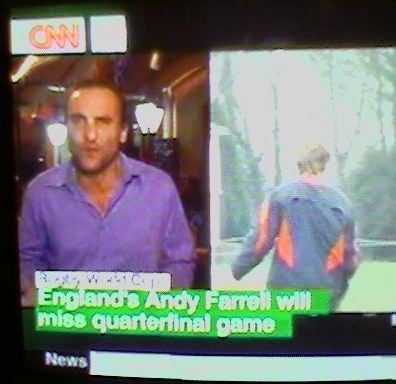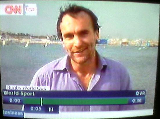Michael is currently in France, where he will be covering the Rugby World Cup for CNN/International for the next three weeks. I have some low-tech screengrabs -- also known as having someone snap photos from a TV screen -- to show off what fun he's having. Many thanks to Mavis for these!