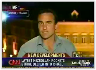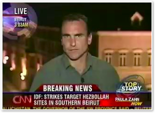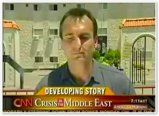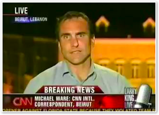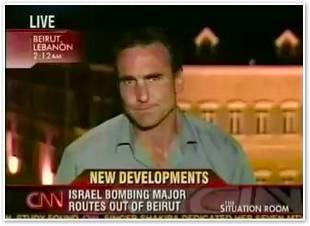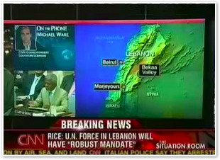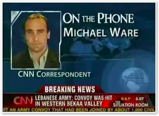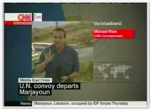 We join CNN International in the midst of Michael’s report on the convoy of 1500 vehicles leaving Marjayoun. The cars stream past behind him as he talks about the civilian flight from the fighting.