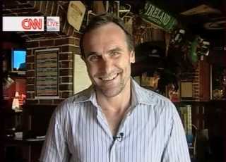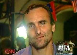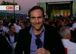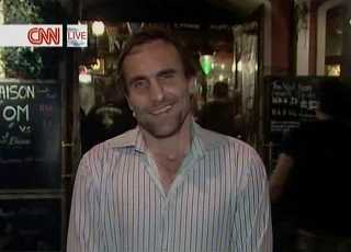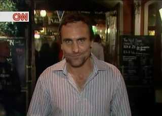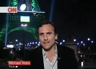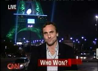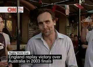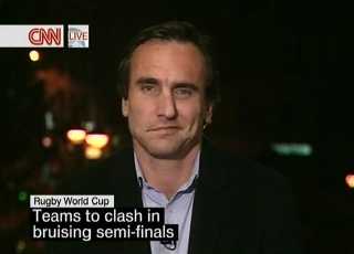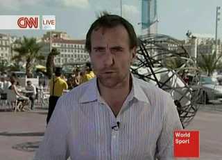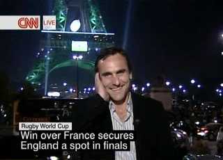 Michael gets a colorful background as he reports on the results of the England/France semifinal from Paris. (Still, how weird is it to see him identified as CNN SPORTS CORRESPONDENT in the transcript?)