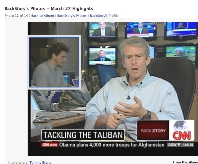 This afternoon on BackStory, they spoke with Nic Robertson in the Baghdad bureau. Seated behind him and working diligently throughout the piece ... Tommy Evans. And just in case you didn't notice him, when they posted photos from the show on BackStory's Facebook page, they pointed him out by tagging the photo with his name; when you mouse over that, a box appears over the photo to highlight the man himself: