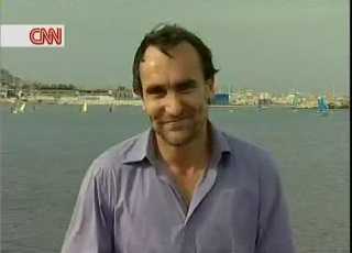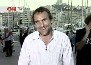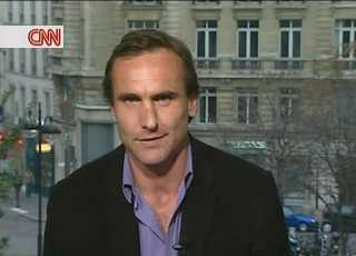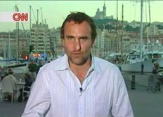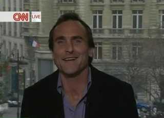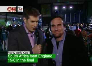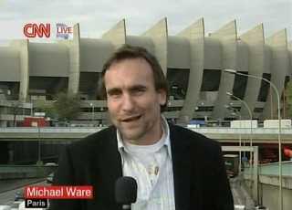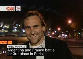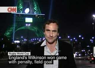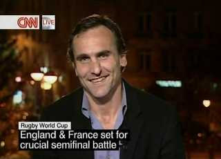 Michael gets a colorful background as he reports on the results of the England/France semifinal from Paris. (Still, how weird is it to see him identified as CNN SPORTS CORRESPONDENT in the transcript?)