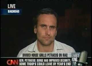Larry speaks with Michael, Anderson Cooper, and radio talk-show hosts Lars Larson and Ed Schultz about the Petraeus/Crocker testimony. The only surprise so far is that some people are surprised by the "Hey, look over there at al-Anbar!" shell game. I mean, hooray for the improvements in Anbar, but that has nothing to do with the surge, so stop trying to muddy the waters.