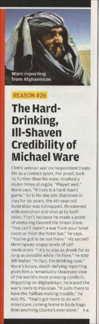 Read More...Rock stars may become passé in my world. I thought they might be on their way out of my heart when Anderson Cooper hit the spotlight, but now that I have seen/heard Michael Ware, “It’s all over Baby Blue”-Dylan. Mr. Ware is a foreign correspondent for CNN that works from the trenches in the old school style similar to Ernie Pyle. With his Aussie accent and broken nose he appears to be more of a brawler than bookish, but the guy gets it. Recently on an episode of HBO’s Bill Maher show he explained the trichotomy of India/Pakistan and Afghanistan more clearly and efficiently than anyone I’ve heard yet. I actually understood what he was saying and why we may be in the predicament we are in. I am aware that perhaps it’s my level of understanding that may be in question rather than the talking heads lack of knowledge, but what matters is that I found a source I am comfortable with.