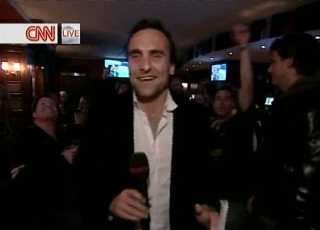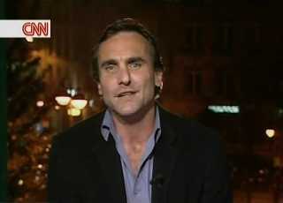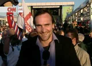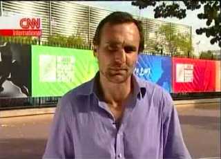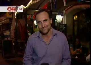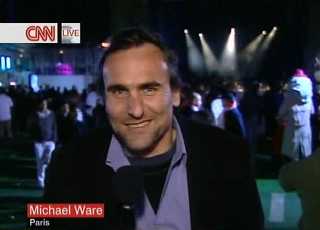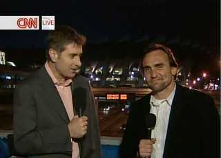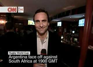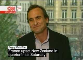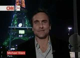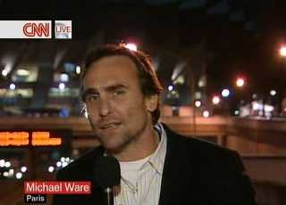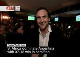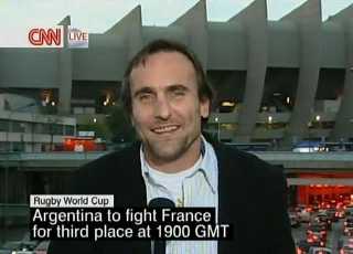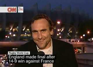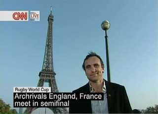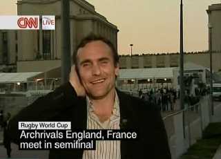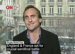 Michael gets a colorful background as he reports on the results of the England/France semifinal from Paris. (Still, how weird is it to see him identified as CNN SPORTS CORRESPONDENT in the transcript?)