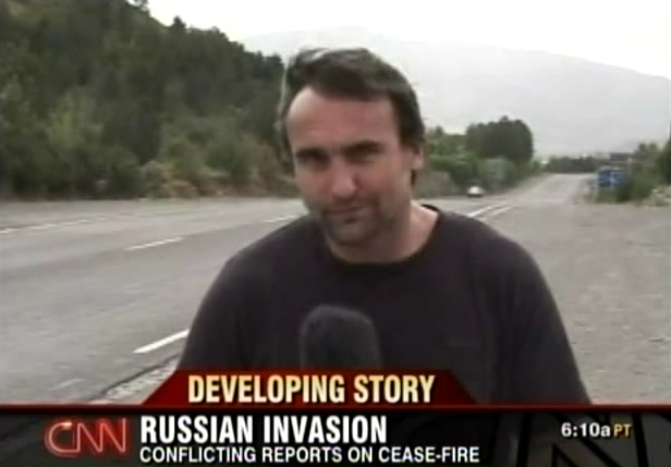 Newsroom replays a stand-up originally done for International. Michael describes the Russian army troops who have just left the road outside Gori.
