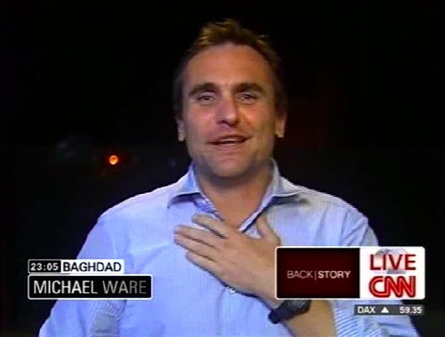 "Transcendent" is how Michael describes the sheer joy evident at the packed football stadium in Baghdad for the first international game played there since before the war began. This piece for BackStory shows Michael's eye for capturing the moment even as he loses his voice while trying to be heard over the noise. Jim Clancy clearly enjoys presenting the piece, although his compliment at the end is sidestepped. (And just in case Michael ever sees this: Jim is right. Just sayin'.)